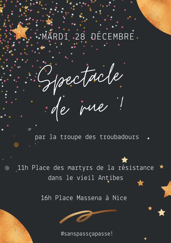 Nous vous donnons rendez vous mardi 28 décembre à 11h dans le vieil Antibes et à 16h Place asséna dans les Alpes Maritimes, pour un moment de partage.