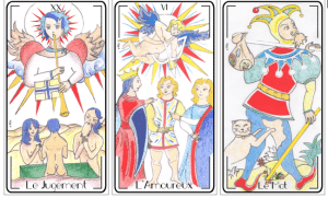 Le Mat : Deuxième carte non chiffrée, c’est la 22ième carte du Tarot. Elle représente notre zone d’ombre, c’est à dire tout ce que le Tarot nous invite à travailler en nous-même, dans notre vie, dans notre entourage, dans la société.